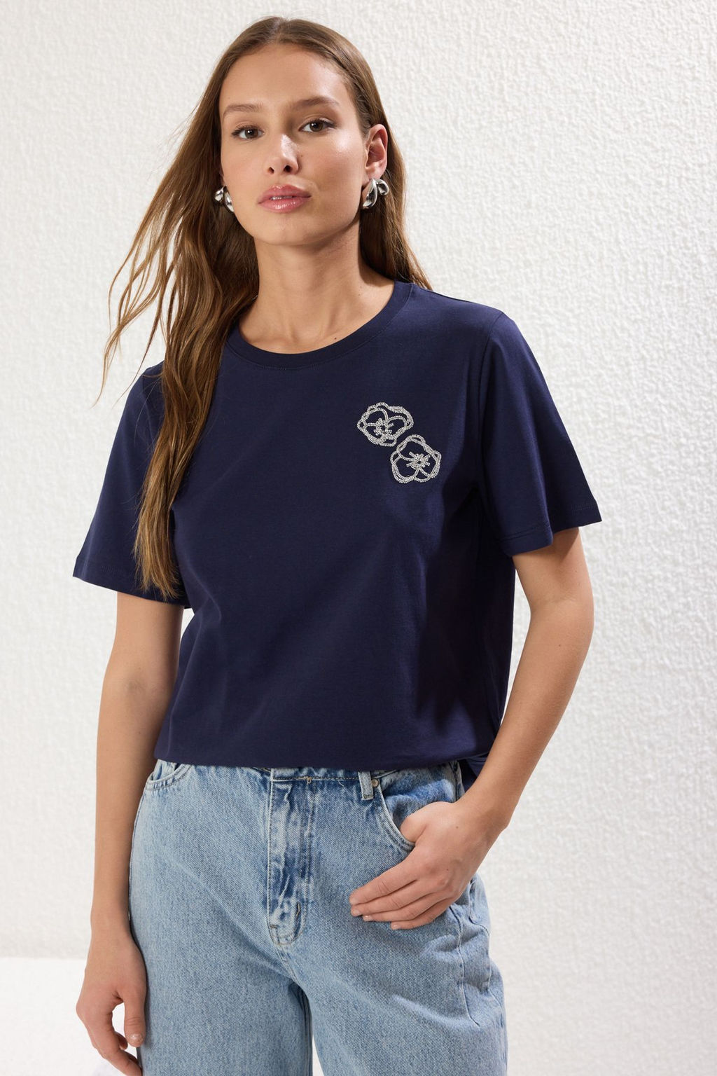 TRENDYOLMILLA Lacivert %100 Pamuk Cicek Nak?sl? Regular/Normal Kal?p Orme T-Shirt TWOSS25TS00042