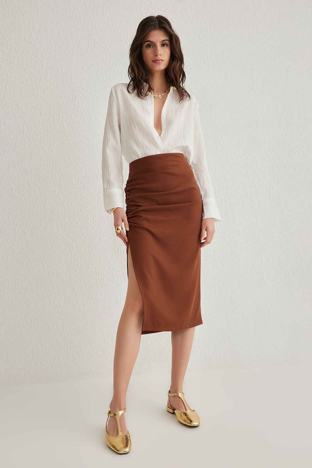TRENDYOLMILLA Koyu Kahverengi Buzgulu Y?rtmac Detayl? Kalem Fit Midi Dokuma Etek TWOSS20ET0045