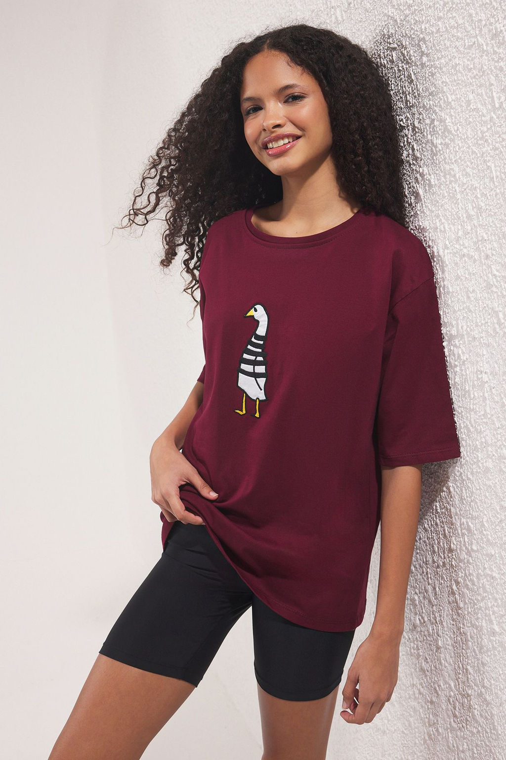Trendyolmilla Bordo %100 Pamuk Ordek Nak?sl? Rahat/Relaxed Kesim Bisiklet Yaka Orme T-Shirt TWOSS25TS00201