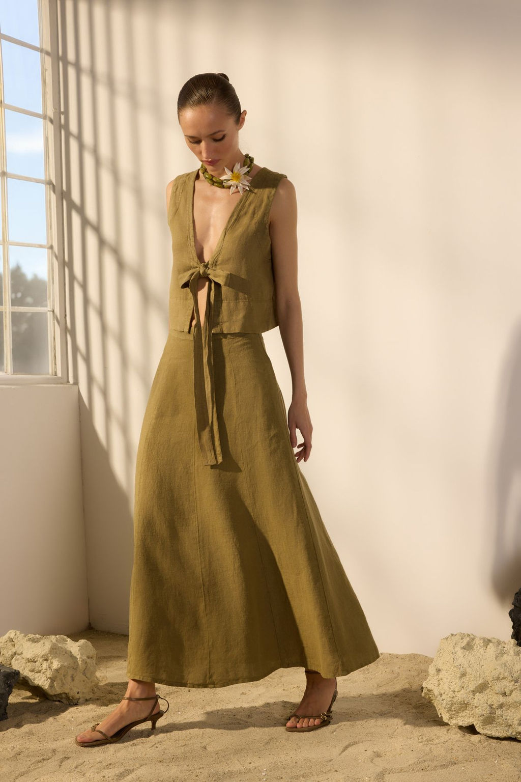 Trendyolmilla Haki %100 Keten Midi Volanl? Etek TWOSS25ET00137