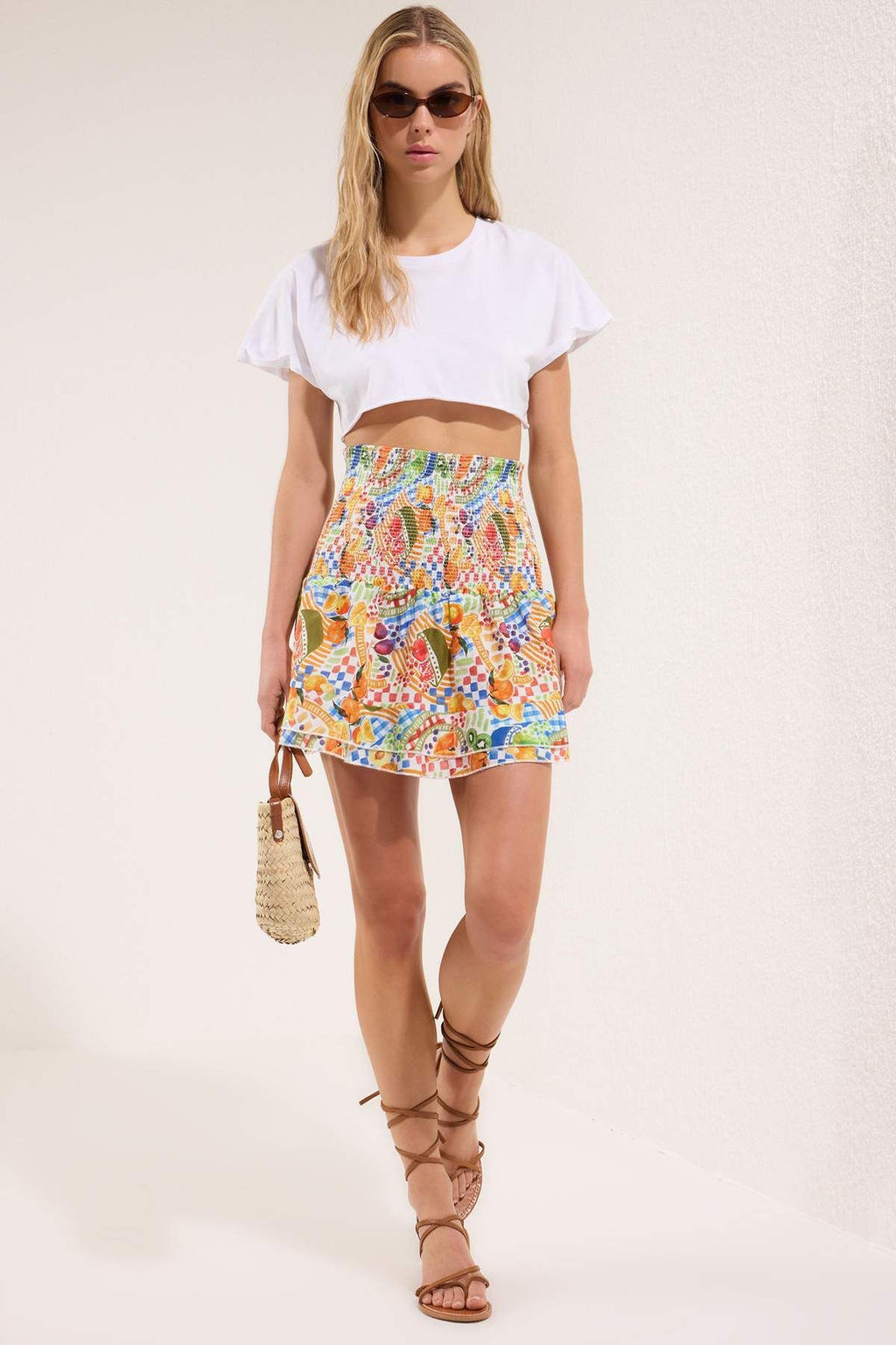 Trendyolmilla Cok Renkli Etegi Katl? Desenli Yazl?k %100 Pamuk Mini Etek TWOSS25ET00187