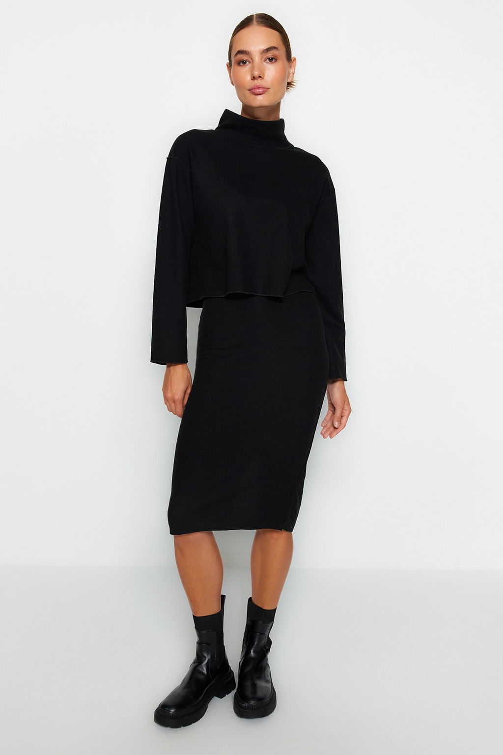 Trendyolmilla Siyah Normal Bel Selanik/Triko Gorunumlu Midi Kalem Orme Etek TWOAW24ET00030