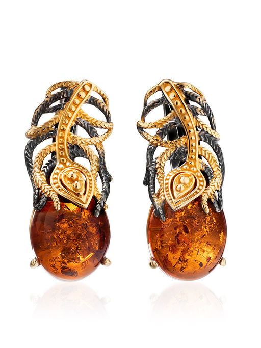 Красивые серьги Павлин из коньячного янтаря с позолотой