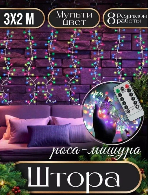 Гирлянда новогодняя светодиодная штора, занавеска "Роса мишура" 3х2 м, с пультом, 8 режимов , цвет мульти (разноцветный)