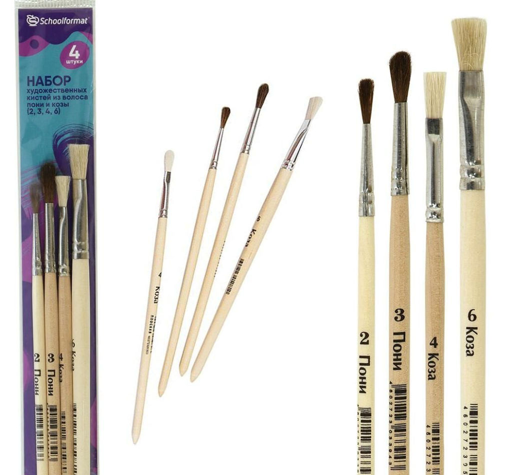 Набор кистей (№2,3 круглая - пони, №4,6 плоская - коза) 4 шт