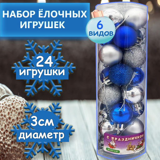Набор новогодних шаров 24шт.,d-3см.,6 дизайнов в1 ,серебро+синий