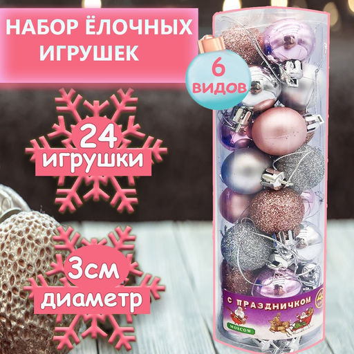 Набор новогодних шаров 24шт.,d-3см.,6 дизайнов в1 ,серебро+розоый