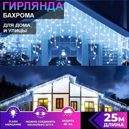 Гирлянда Бахрома 25х0,6м холодно белое мерцающее свечение,белый провод