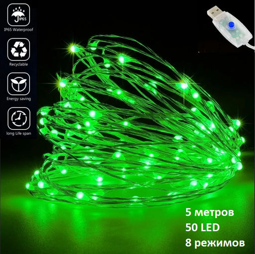 Электрогирлянда зелёная Светодиодная 50 ламп, 5 м, питание от порта USB, 8режимов