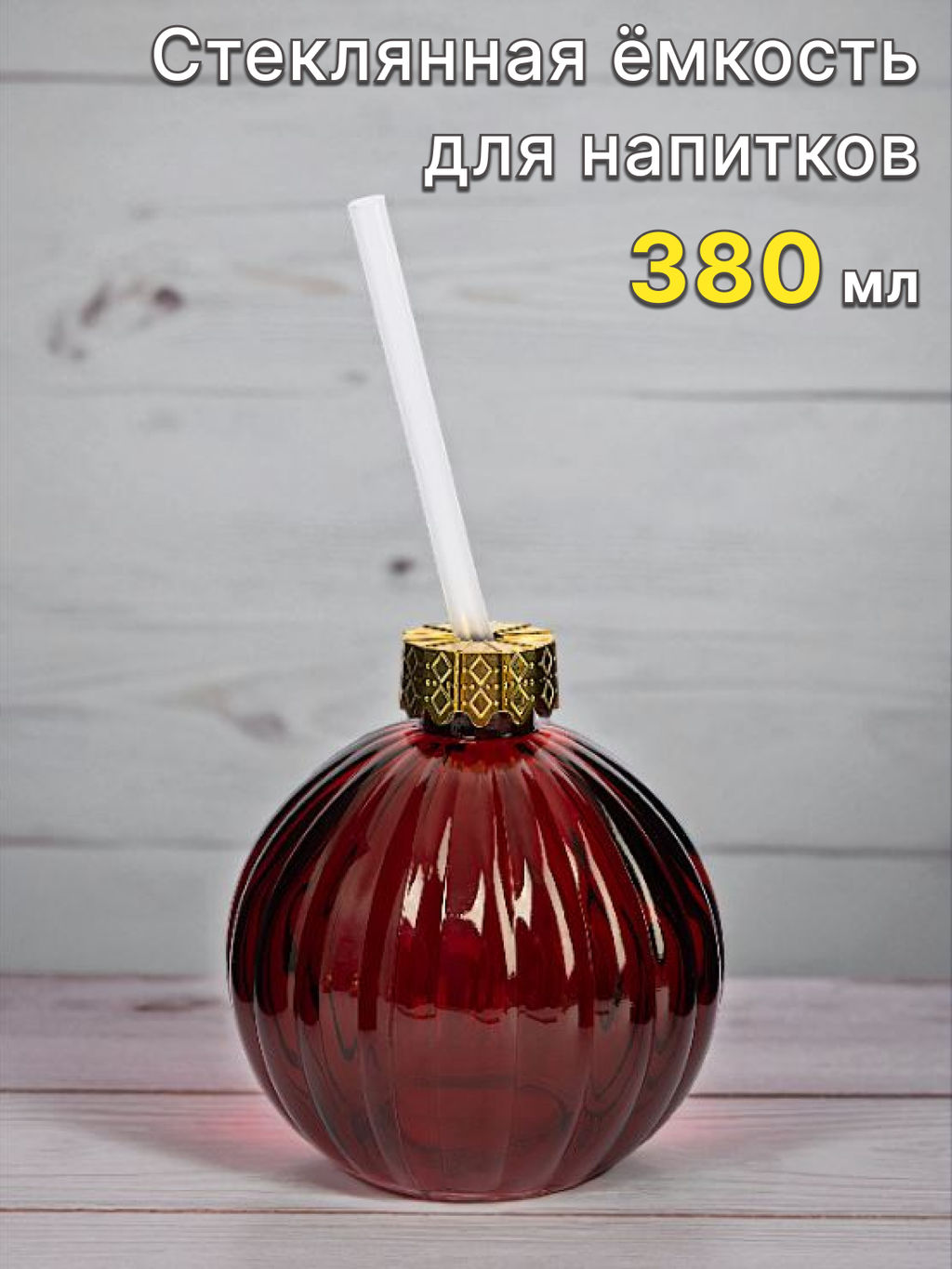 Банка для напитков, 380 мл, с крышкой и трубочкой, стекло, красная, Шар, New year