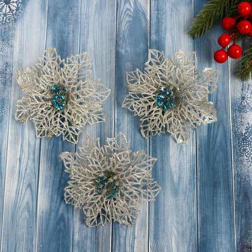 Цена за 2 шт. Ёлочные игрушки 3 шт. Зимнее волшебство. Ажурный цветок пластик, 10.5 см, серебро