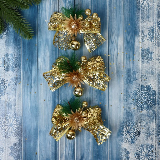 Ёлочные игрушки 3 шт. Зимнее волшебство. Еловая композиция пластик, бант блеск, цветок, 117 см, золото