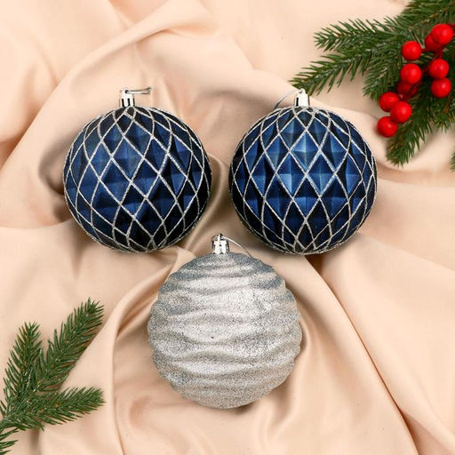 Ёлочные игрушки Корнелия сеточка, шары новогодние, d=10 см, набор 3 шт., серебристо-синий