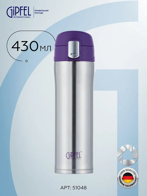 51047 GIPFEL Термокружка вакуумная BONN 430 мл с герметичной крышкой на замке. Материал: нержавеющая сталь 304, пластик, силикон. Цвет: фиолетовый.