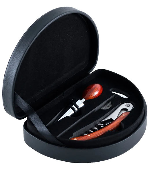 9631 GIPFEL Набор винных аксессуаров из 3 предметов в кейсе из кожи. 16х12х4 см. Материал: искусственная кожа, сплав цинка, нерж сталь. Цвет: черный.