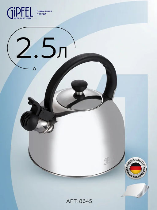 8645 GIPFEL Чайник для кипячения воды ESSEN 2.5л со свистком, с индукционным дном. Материал: нержавеющая сталь 18/10. Материал ручки: бакелит. Толщина: 0,4мм