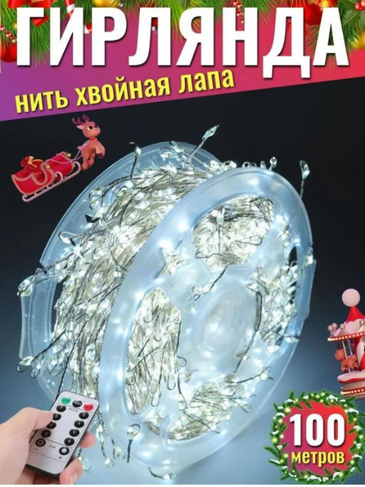 Гирлянда нить МИШУРА, хвойная лапа, (провод БЕЛЫЙ) с ПУЛЬТОМ, свечение холодное - белое