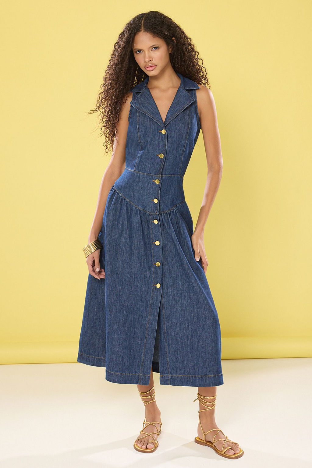 TRENDYOLMILLA Koyu Mavi Gomlek Yaka Midi Denim Elbise TWOSS25EL00149