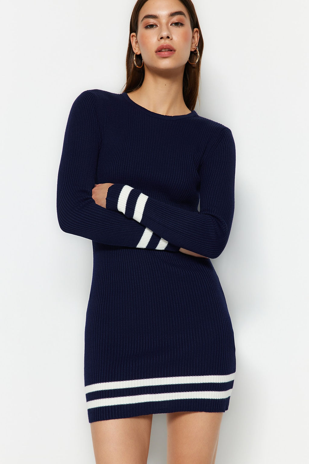 TRENDYOLMILLA Siyah Mini Triko Etek Ucu Cizgili Elbise TWOAW20EL1274