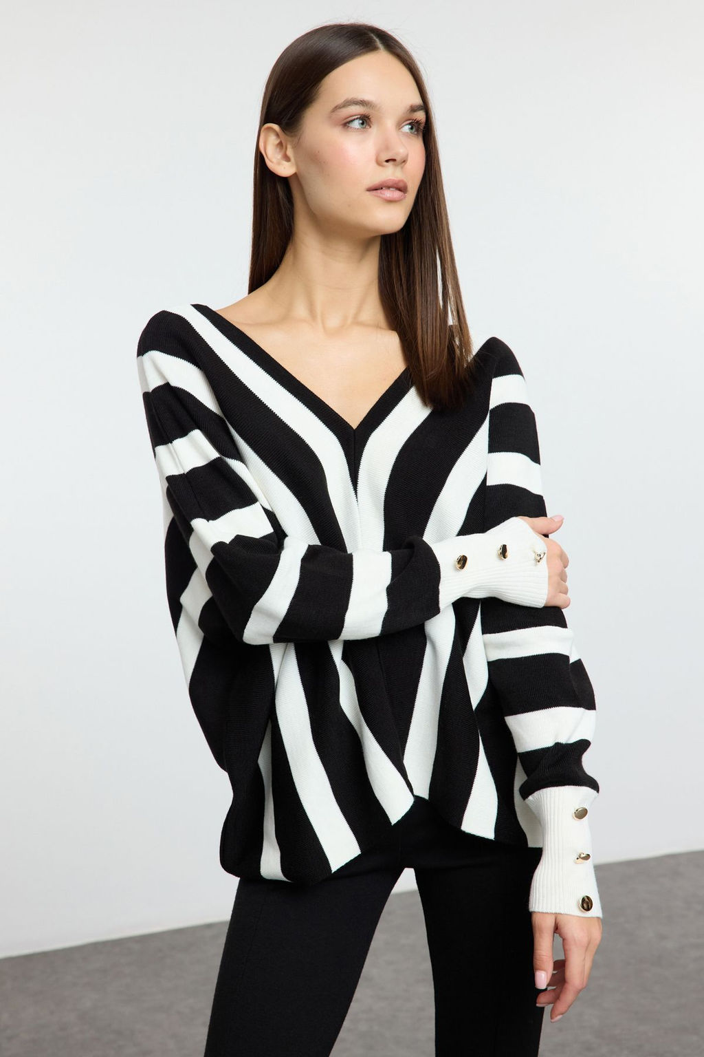 Siyah Derin V Yaka Cizgili Triko Kazak TWOAW25KZ00390