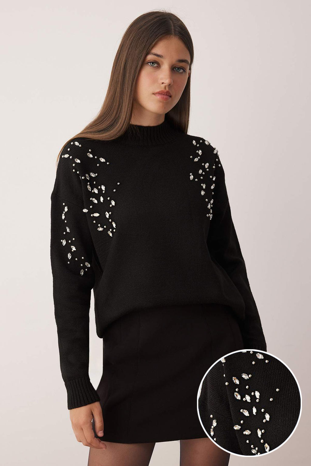 Siyah Yumusak Dokulu Genis Kal?p Tas Islemeli Triko Kazak TWOAW26KZ00144