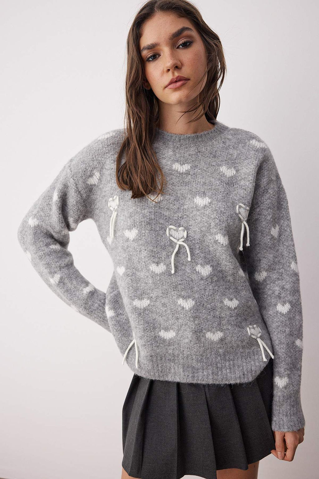 Gri Yun Kar?s?ml? Kalp Desenli Oversize/Genis Kal?p Triko Kazak TWOAW26KZ00018