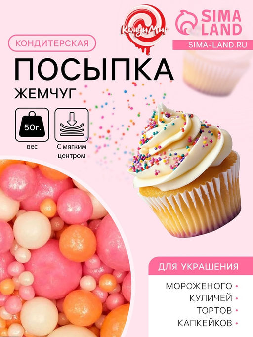 Цена за 2 шт. Кондитерская посыпка с мягким центром Жемчуг персиковый, розовый, белая, 50 г