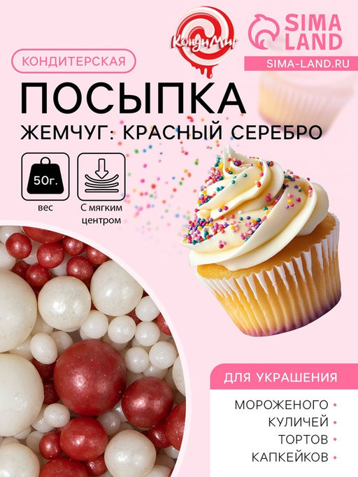 Цена за 2 шт. Посыпка кондитерская с мягким центром Жемчуг: красный, серебро, 50 г