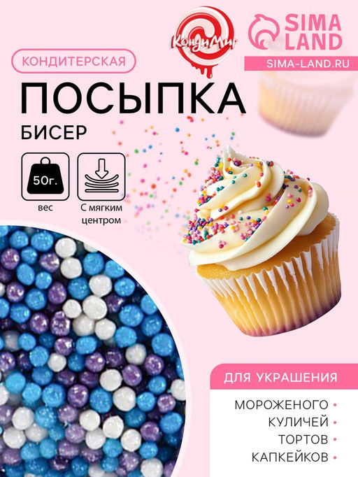 Цена за 2 шт. Посыпка кондитерская с мягким центром Бисер: сиреневая, голубая, серебряная, 50 г