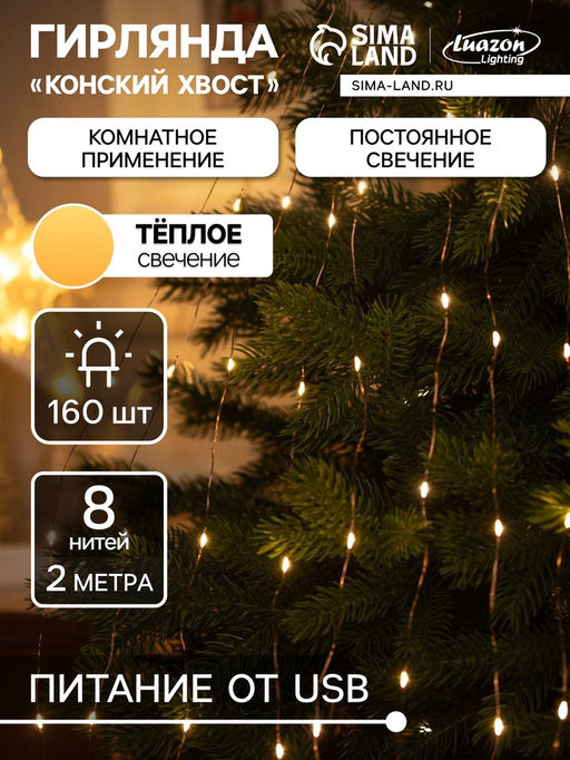 Гирлянда Конский хвост 8 нитей по 2 м, IP20, медная нить, 160 LED, свечение тёплое белое, USB