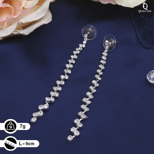 Серьги висячие со стразами Princess дорожка утончённая, белые в серебре,8 см