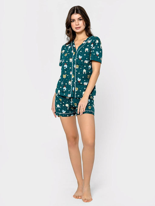 Комплект женский (джемпер, шорты) зеленый с принтом "зверята"
