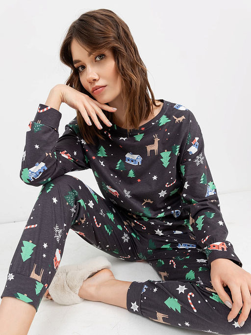 Хлопковый комплект (джемпер, брюки) в графитовом цвете с принтом в виде оленей