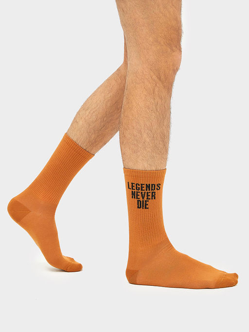 Цена за 5 пар! Носки мужские коричневые с рисунком в виде надписи "LEGEND NEVER DIE"