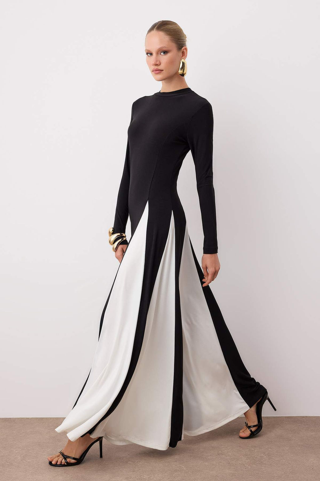 Siyah-Beyaz Renk Bloklu Orme Maxi S?k Abiye Gece Mezuniyet Elbisesi TPRAW26AE00017