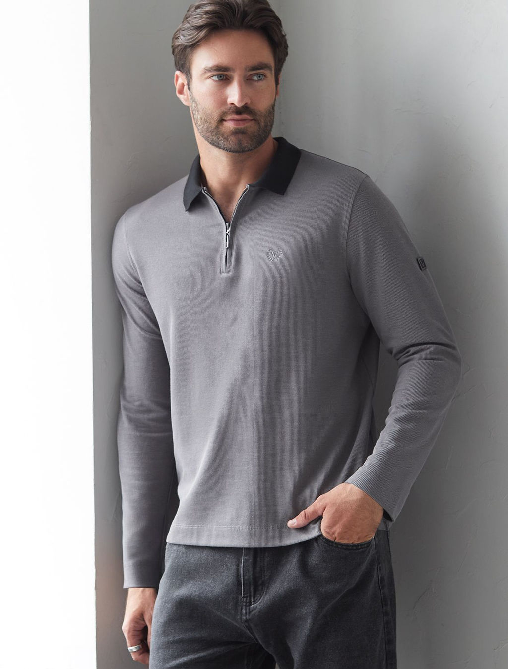 Лонгслив из мягкого фактурного трикотажа с плетеным воротником поло на молнии