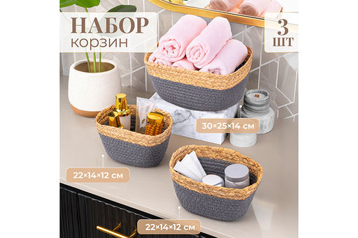 Набор 3 плетеных корзин 1 корзинка 30*25*14 см, 2 корзинки 22*14*12 см, серый