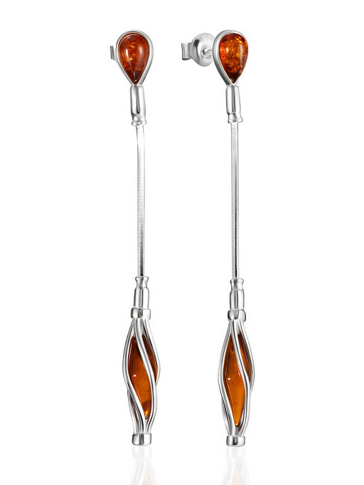 Длинные серьги с коньячным янтарём на застёжках-гвоздиках Алжир