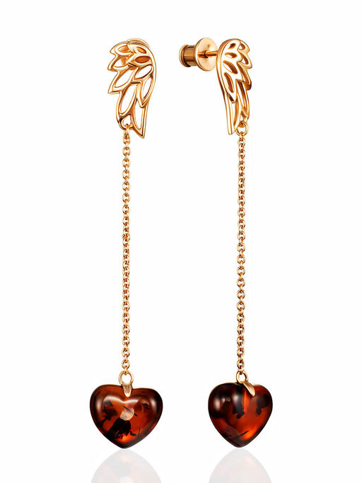 Позолоченные серьги-цепочки с натуральным вишнёвым янтарём Сердце