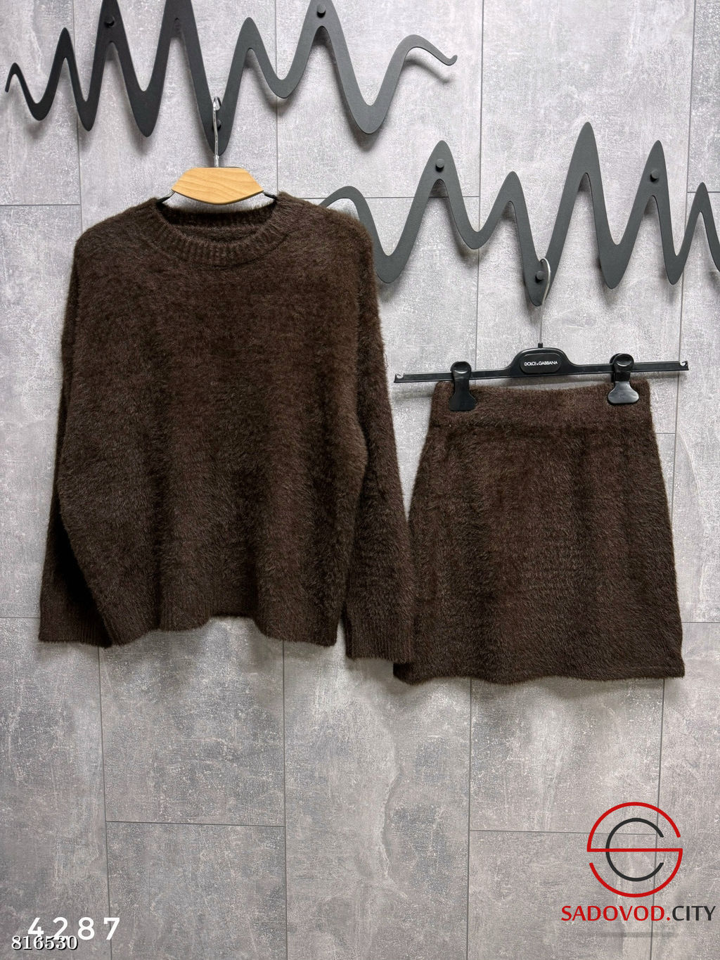 Костюм двойка состоит из свитера с круглым горлом и юбки-мини на резинке
