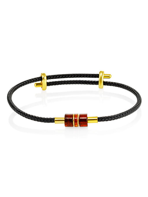 Необычный браслет на твёрдой плетёной основе с янтарной вставкой