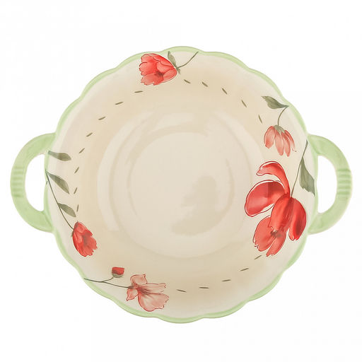 "Бархатный мак" Салатник фарфоровый 1,1л, д19,3см, h7см, с деколью, 2 ручки (24х7,5см), волнистый борт, рифленый край, кремовый (Китай)
