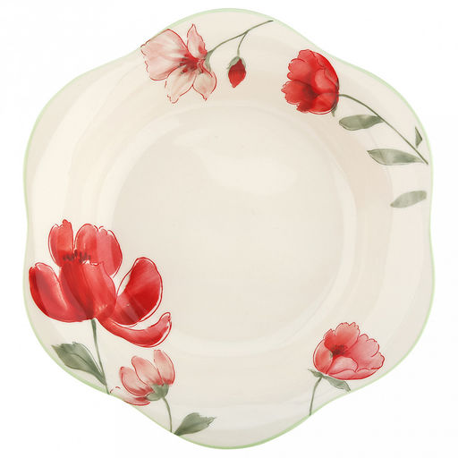 "Бархатный мак" Тарелка глубокая фарфоровая д205мм, h42мм, 480мл, с деколью, волнистый край, кремовый (Китай)
