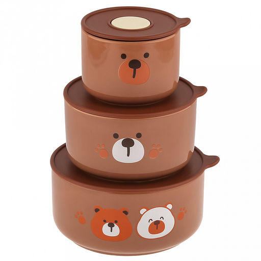 "Три медведя" Салатник-контейнер фарфоровый, набор 3 штуки: 300мл, д9,3х6,8см; 580мл, д12,6х7,1см; 820мл д14,9х7,3см, цветной, цвет - капучино, пластмассовая крышка, герметичная, с пароотводом, в подарочной коробке (Китай)