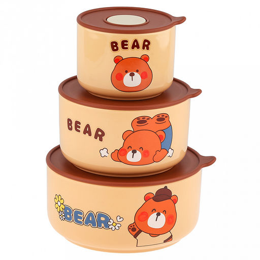 "Три медведя" Салатник-контейнер фарфоровый, набор 3 штуки: 300мл, д9,3х6,8см; 580мл, д12,6х7,1см; 820мл д14,9х7,3см, цветной, цвет - карамельный, пластмассовая крышка, герметичная, с пароотводом, в подарочной коробке (Китай)