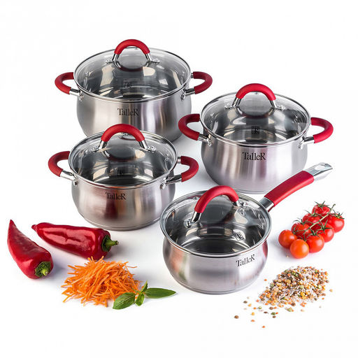 Набор посуды из нержавеющей стали "Милфорд" 4 штуки: кастрюли 2,2л - д18см, h9см, 3,2л - д20см, h10,5см, 5,2л - д24см, h11,5см, ковш 1,5л - д16см, h8см, s0,6мм, дно s2,8мм, полировка матовая снаружи, зеркальная внутри, стеклянная жаропрочная крышка,