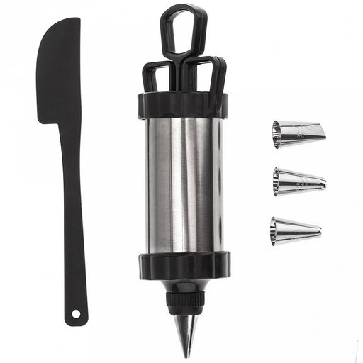 Кондитерский шприц "Крем-чиз" 18х6,3х6,3см, нержавеющая сталь; насадка для крема - 4 штуки, нержавеющая сталь; шпатель 18,7см пластик; цвет - черный, в блистере (Китай)