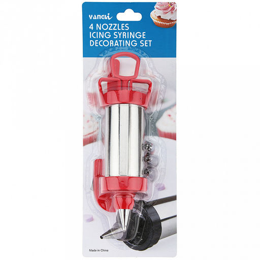Кондитерский шприц "Крем-чиз" 19х6,3х6,3см, нержавеющая сталь; насадка для крема - 4 штуки, нержавеющая сталь; лопатка 18,7см, пластик; цвет - красный, в блистере (Китай)