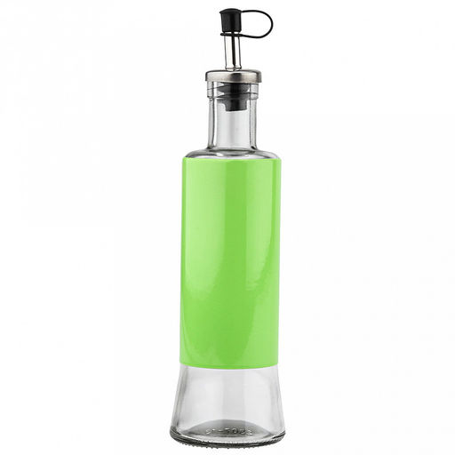Бутылка для масла стеклянная "В юбке" "Валенсия" 320мл, д6,5см, h21см, д/горла 2см, дозатор из нержавеющей стали, в цветной металлической оплетке, цвета в ассортименте: черный, красный, салатовый, д/основания 6см (Китай)