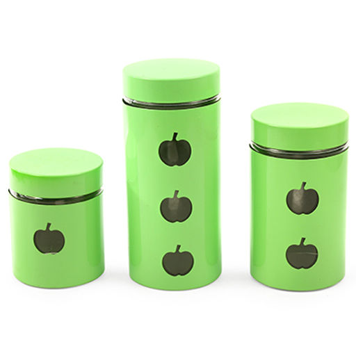 Банка для сыпучих продуктов стеклянная "Яблоко" набор 3 шт: 1,3л - д9,5х22,5см; 1л - д9,5х17,5см; 0,65л - д9,5х12,5см, винтовая металлическая крышка, в металлической оплетке, зеленый, в цветной коробке (Китай) (д/горла 8,3см д/основания 9см)